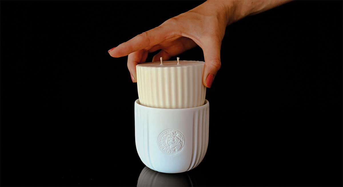 Eco conçu, la première bougie de la marque a été pensé pour être rechargeable. Cette démarche permet aux clients de découvrir de nouvelles fragrances tout en réduisant la production des écrins de porcelaine avec une réduction de notre empreinte carbonne de plus de 80%.